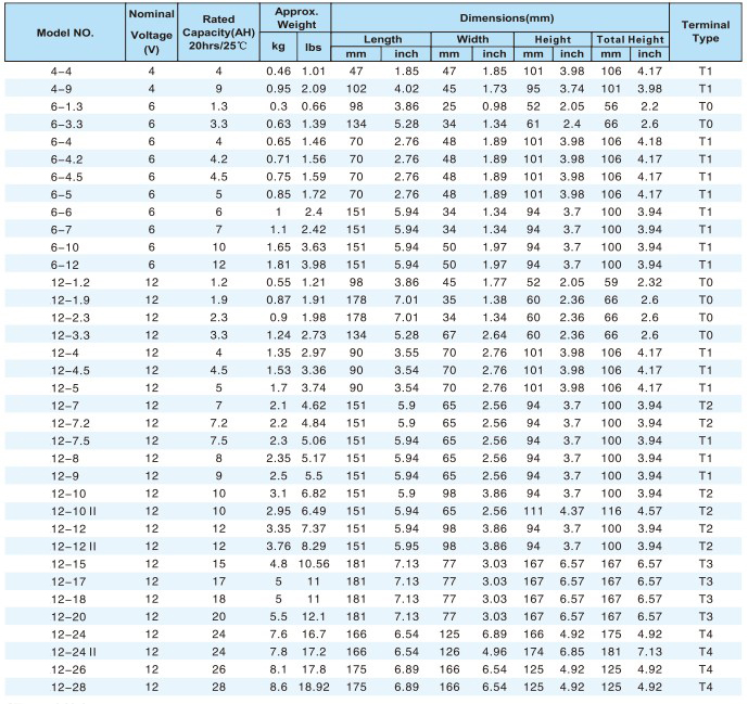 应用范围: 应急照明;电动工具;电动玩具;测量仪器;消防报警;安全警报;UPS系统;控制系统;医疗器械;备用电力能源;计算机备用电源;电力系统;铁路系统;发电站;船舶设备;军用设备及电话交换机等 性能特点: 特殊的高锡合金极板,高性能吸附式隔板,阀控密封结构,无游离酸,无需补水维护,自放电小,可倒放90°安全使用。 技术特点: 电压:4V 6V 12V 容量:0.8~28AH 设计寿命:5年 6-8年 技术参数: